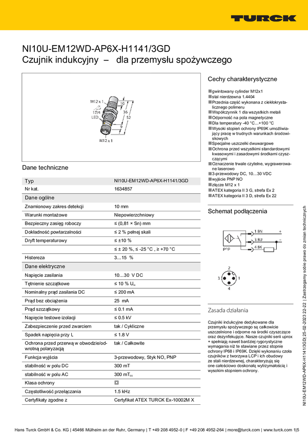 Turck Czujnik indukcyjny nie podtynkowy PNP, Zamykający NI10U-EM12WD-AP6X-H1141/3GD