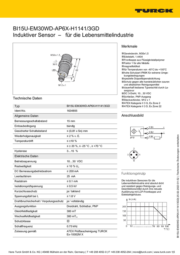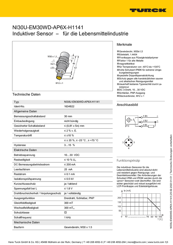 Turck Czujnik indukcyjny nie podtynkowy PNP, Zamykający NI30U-EM30WD-AP6X-H1141/3GD