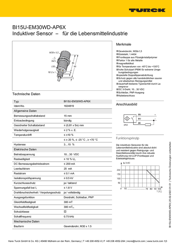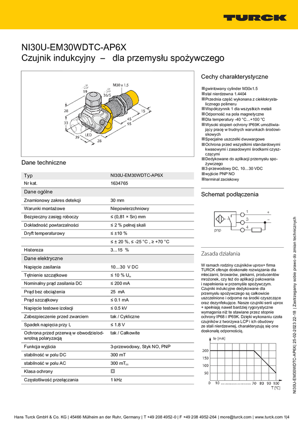 Turck Czujnik indukcyjny nie podtynkowy PNP, Zamykający NI30U-EM30WDTC-AP6X