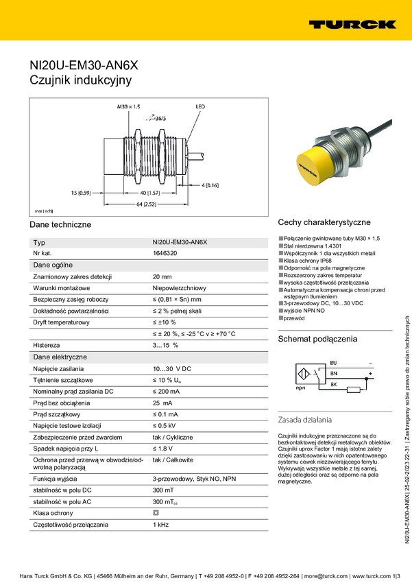 Turck Czujnik indukcyjny nie podtynkowy PNP, Zamykający NI20U-EM30-AP6X
