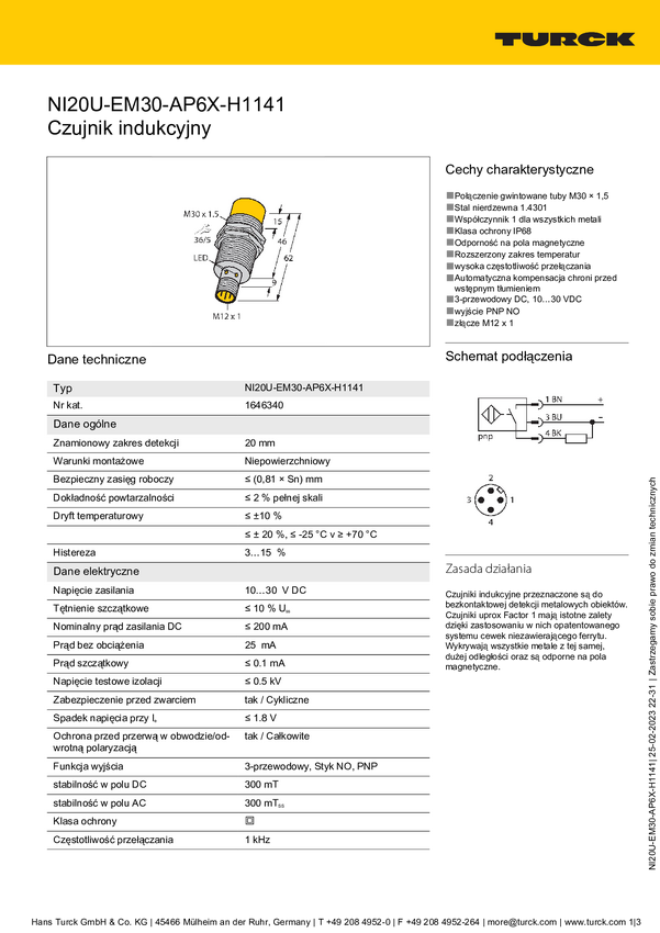 Turck Czujnik indukcyjny nie podtynkowy PNP, Przełącznik NI20U-EM30-VP4X