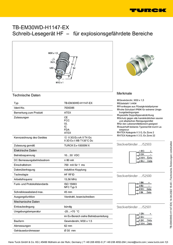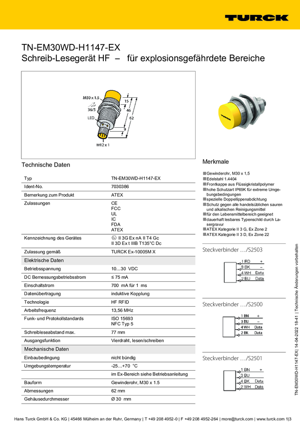 Głowica do odczytu i zapisu Turck TN-EM30WD-H1147-EX 7030386, 1 szt.