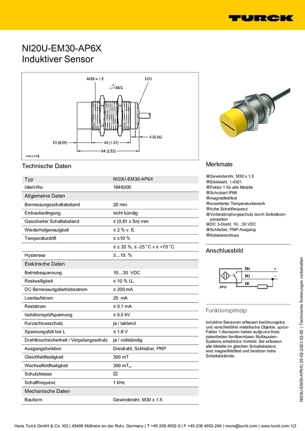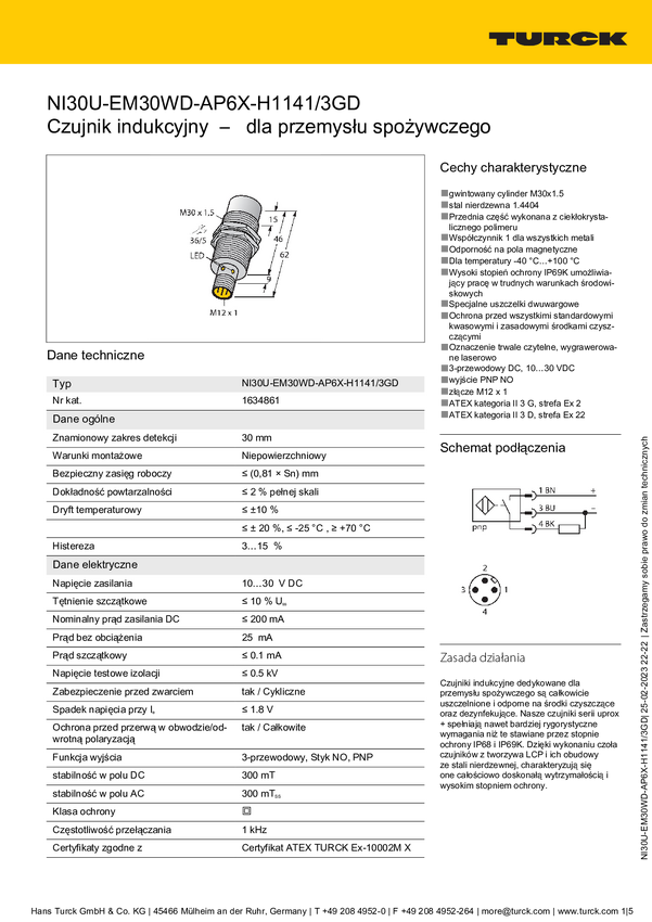 Turck Czujnik indukcyjny nie podtynkowy PNP, Zamykający NI30U-EM30-AP6X-H1141