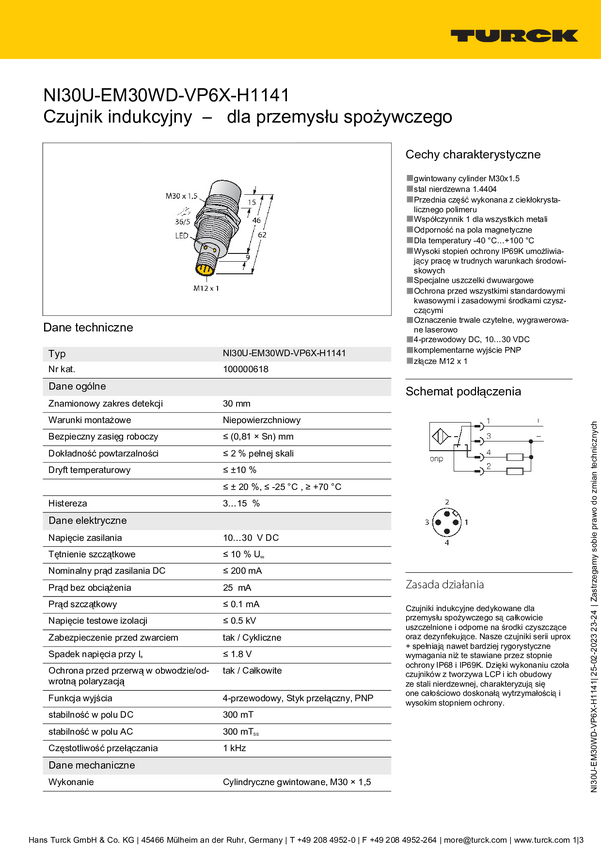 Turck Czujnik indukcyjny nie podtynkowy PNP, Przełącznik NI30U-EM30WD-VP6X-H1141