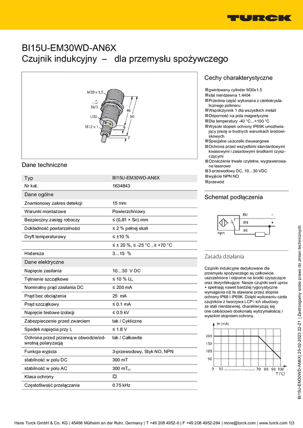 Czujnik indukcyjny Turck BI15U-EM30WD-AP6X, 10 - 30 V, 1 szt.