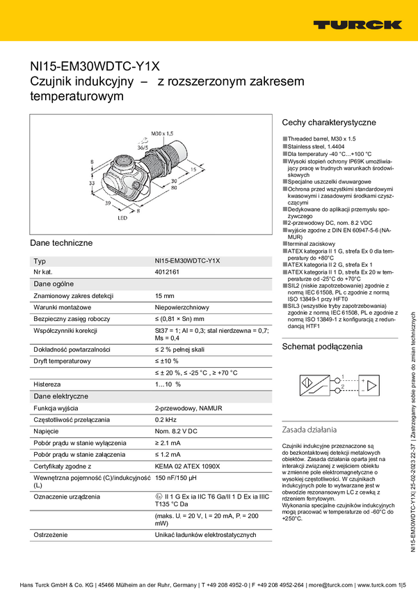 Turck Czujnik indukcyjny nie podtynkowy NAMUR NI15-EM30WDTC-Y1X