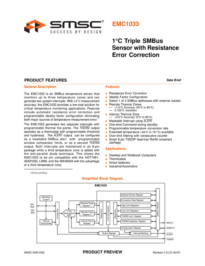 EMC1033 1C Triple SMBus Sensor with Resistance Error Correction Data Brief - EMC1033 1C Triple SMBus Sensor with Resistance Error Correction Data Brief