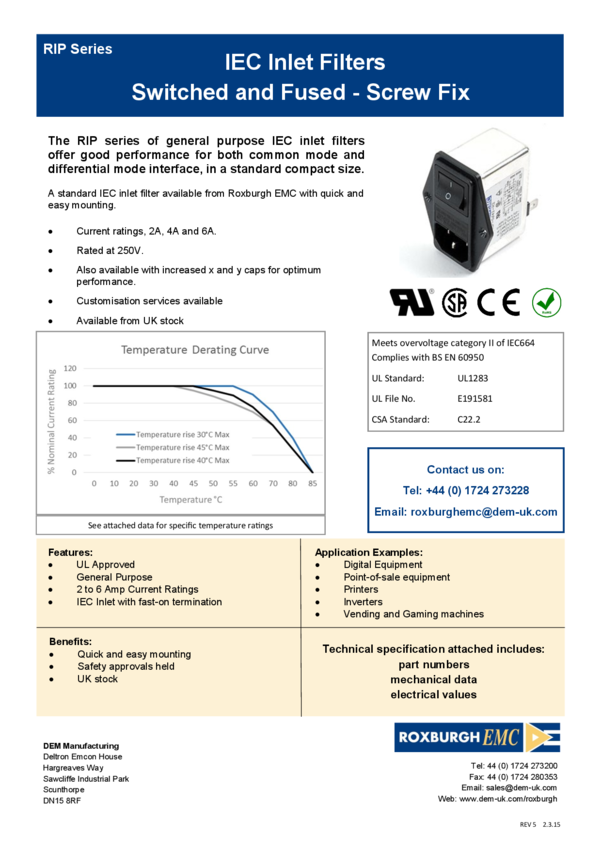 EMI Filter 15A 250VAC/250VDC Faston Chassis Mount