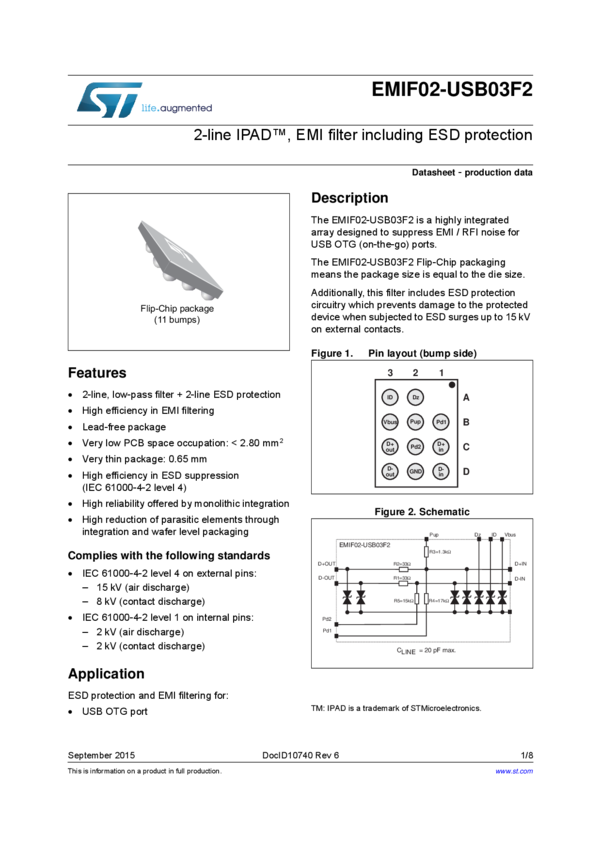 2-line EMI filter and ESD protection with R pull-up for USB interfaces