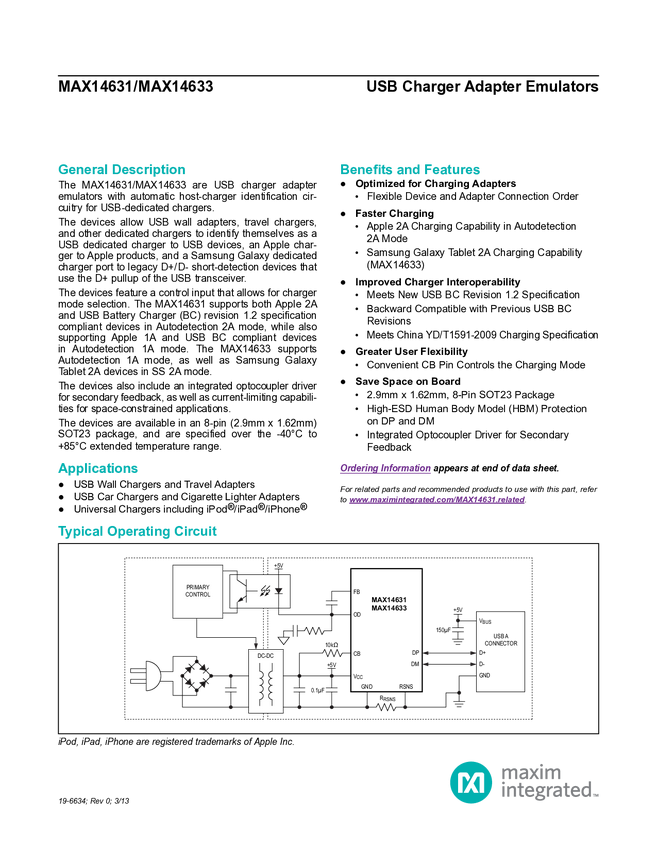 MAX14631, MAX14633 USB Charger Adapter Emulators
