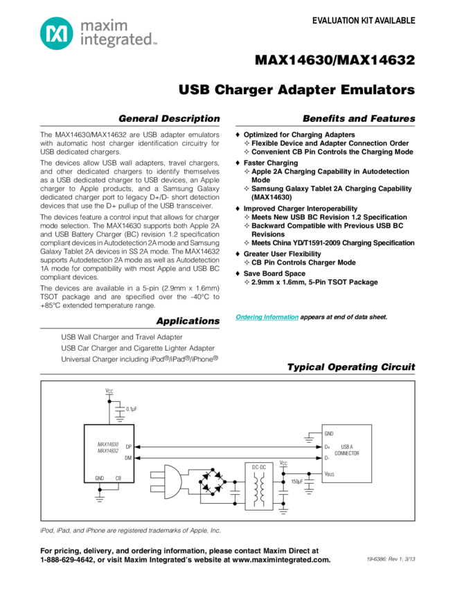 MAX14630, MAX14632 USB Charger Adapter Emulators