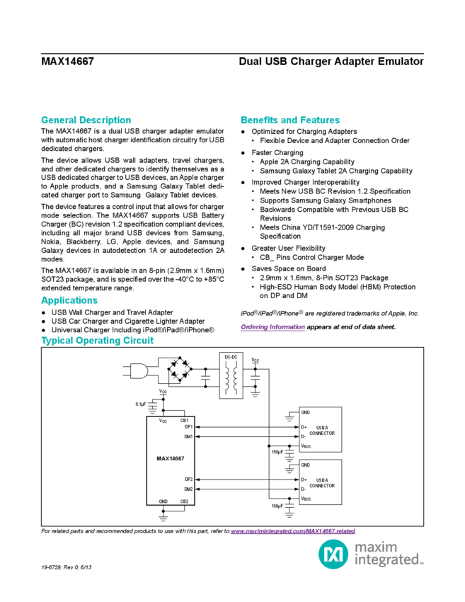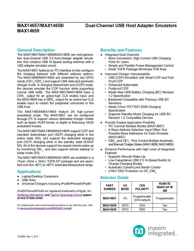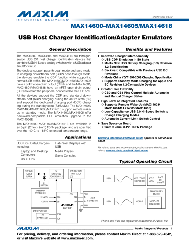 MAX14600, MAX14601, MAX14602, MAX14603, MAX14604, MAX14605, MAX14618 USB Host Charger Identification/Adapter Emulators