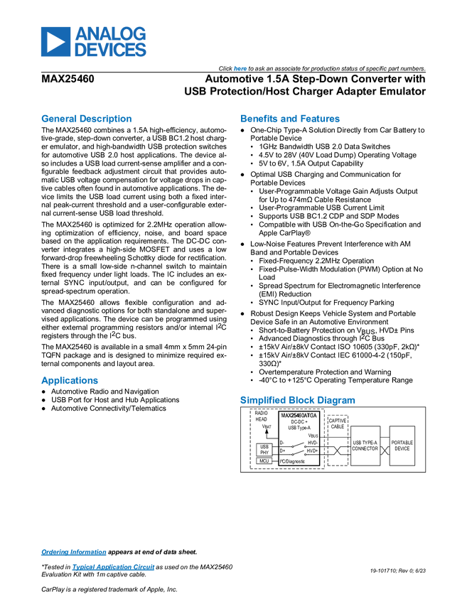 MAX16984 Automotive High-Current Step-Down Converter with USB Protection/Host Charger Adapter Emulator