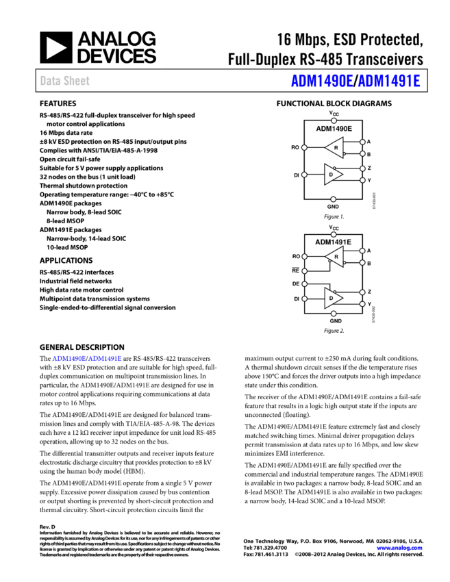 ADM1491E: 5 V, 16 M, ESD Protected, Full-Duplex RS-485 Transceiver (with Driver/Receiver Enable)