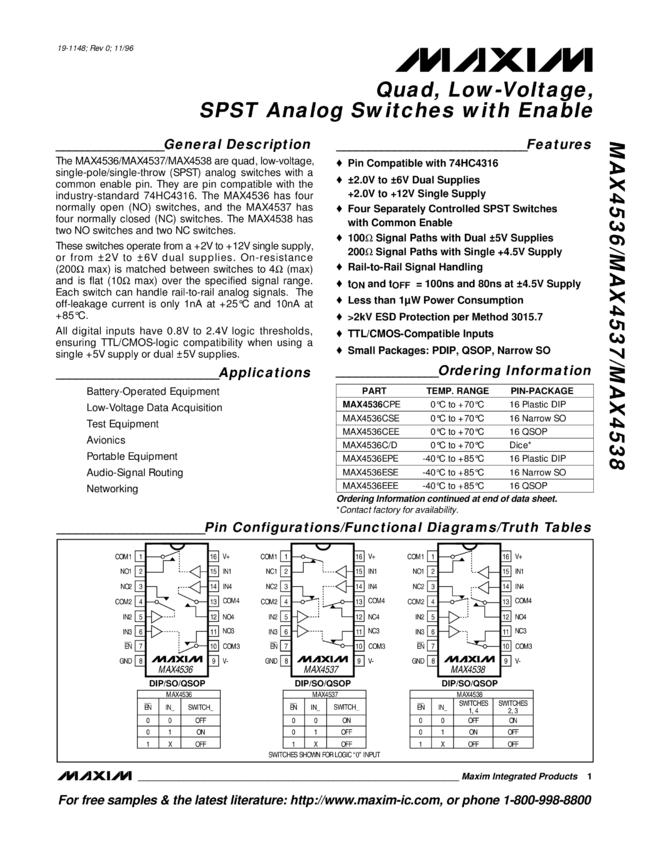 MAX4536, MAX4537, MAX4538 Quad, Low-Voltage, SPST Analog Switches with Enable