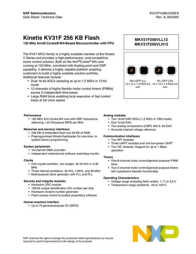 Kinetis KV31: 120MHz Cortex-M4F Real-time Control MCU, 256K Flash, 48K RAM, KMS enabled, 64LQFP,