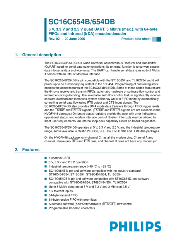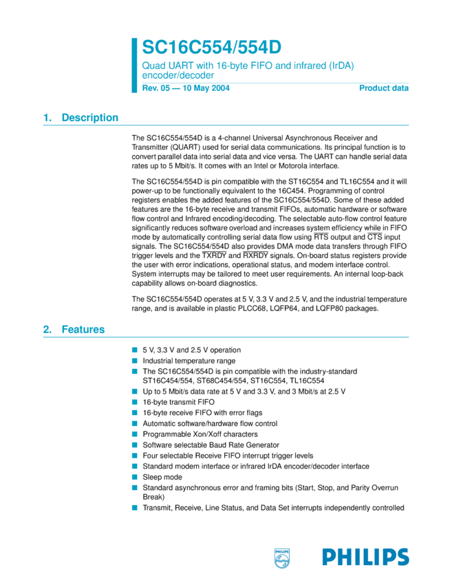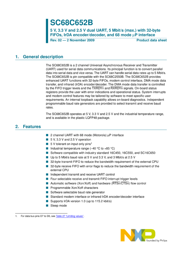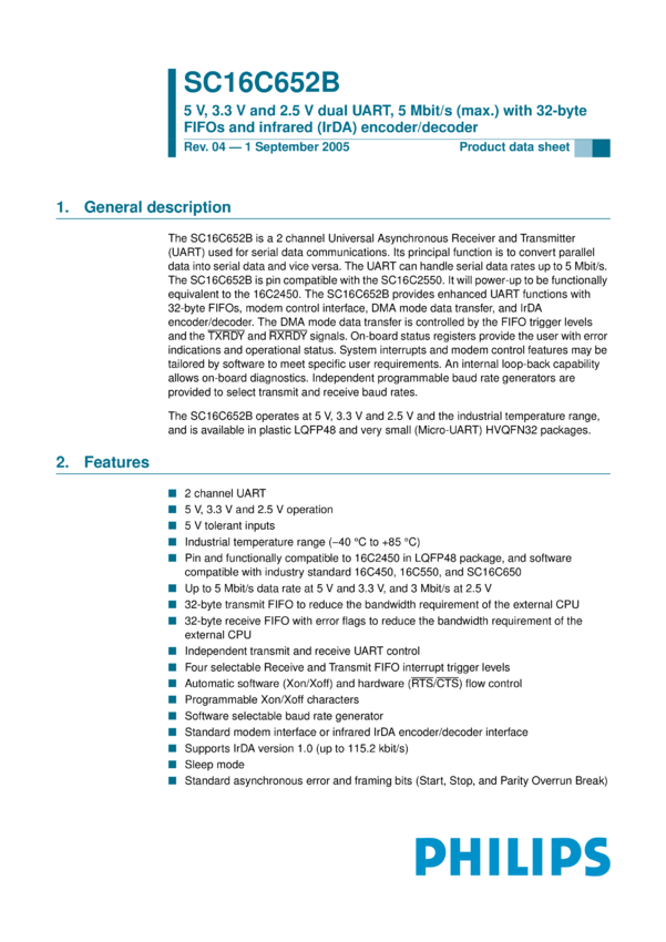 5 V, 3.3 V and 2.5 V dual UART, 5 Mbit/s (max.) with 32-byte FIFOs, IrDA encoder/decoder, and 68 mode uP interface