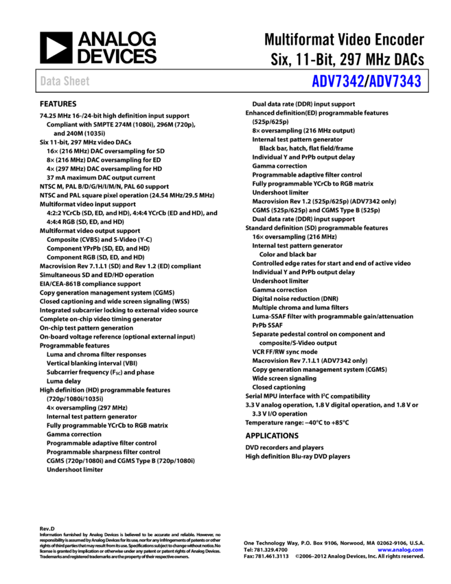 ADV7341: Multi-format Video Encoder Six 12-Bit Noise Shaped Video® DACs