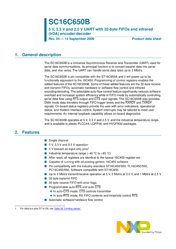 5 V, 3.3 V and 2.5 V dual UART, 5 Mbit/s (max.) with 32-byte FIFOs and infrared (IrDA) encoder/decoder