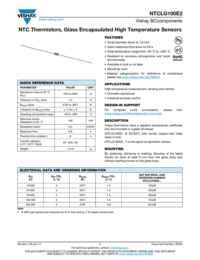 NTC Thermistors, Glass Encapsulated High Temperature Sensors