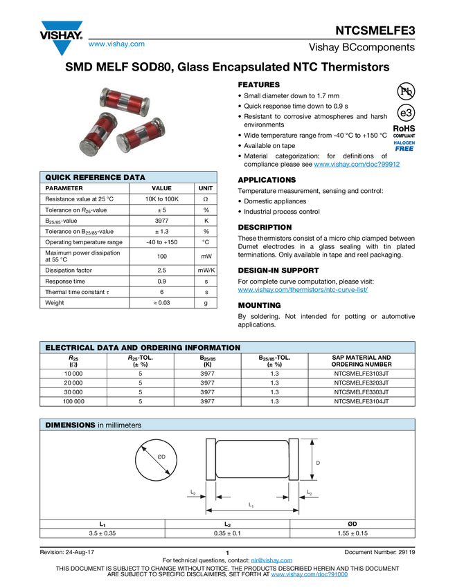 SMD MELF SOD80, Glass Encapsulated NTC Thermistors