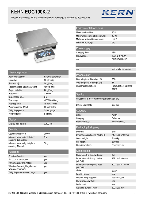 Kern EOC 100K-2 Waga platformowa EOC 100K-2 Zakres pomiaru maks. 150 kg Podziałka 20 g, 50 g poprzez zasilacz sieciowy w
