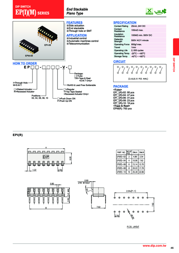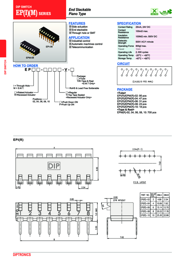 Switch DIP OFF ON SPST 8 Piano 25mA 24VDC Gull Wing SMD T/R