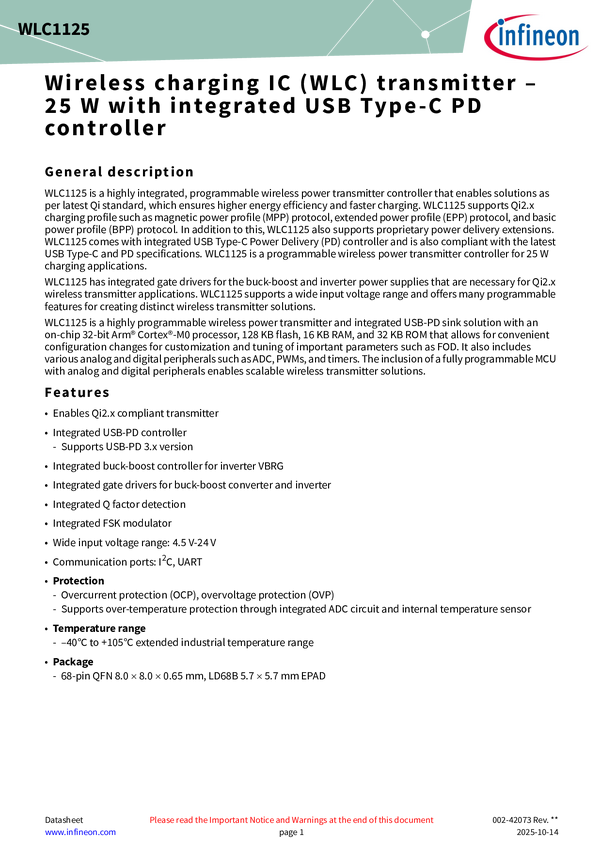 Tape and Reel package: WLC1125 wireless charging transmitter IC with USB-PD, buck-boost, sensing, Qi 2.2 system solution WLC1125 enables a high-performance charging transmitter IC for Qi 2.2 25 W. The highly programmable WLC1125 solution, along with Infineon's OptiMOS™ power devices and authentication IC, offers a highly efficient charging and turn-key compliant solution. The WLC1125-based power transmitter can support 25 W magnetic power profile (MPP), extended power profile (EPP), and basic power profile