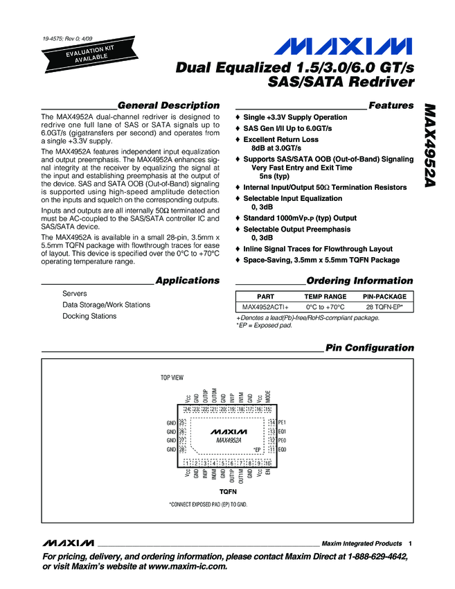 MAX4952A Dual Equalized 1.5/3.0/6.0GT/s SAS/SATA Redriver