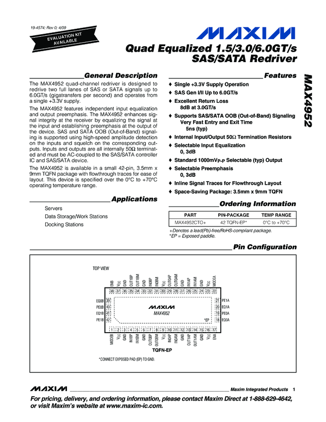 MAX4952 Quad Equalized 1.5/3.0/6.0GT/s SAS/SATA Redriver