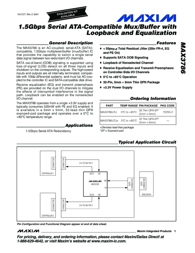 MAX3786 1.5Gbps Serial ATA-Compatible Mux/Buffer with Loopback and Equalization