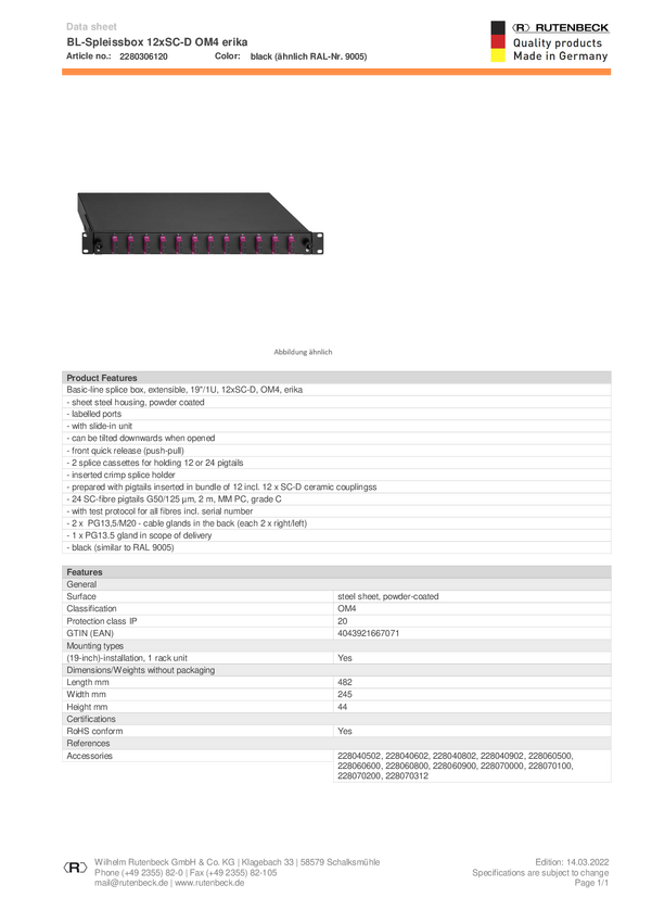 Rozdzielacz światłowodowy Rutenbeck 12xSC-D OM4 erikavio 12 Portów 1 U