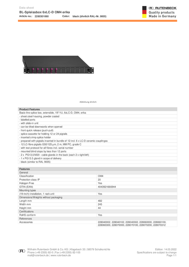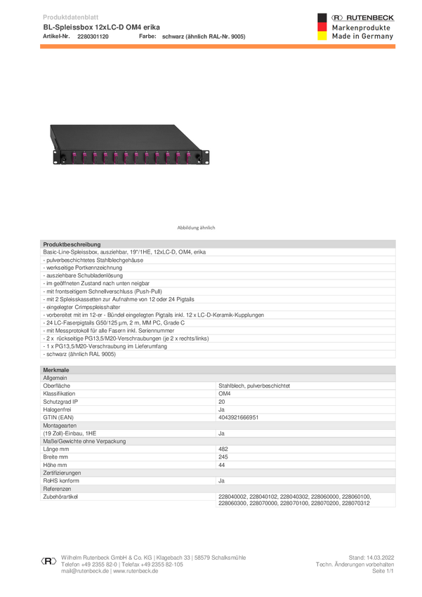 Rozdzielacz światłowodowy Rutenbeck 24xLC-D OM4 erikavio 24 Porty 1 U