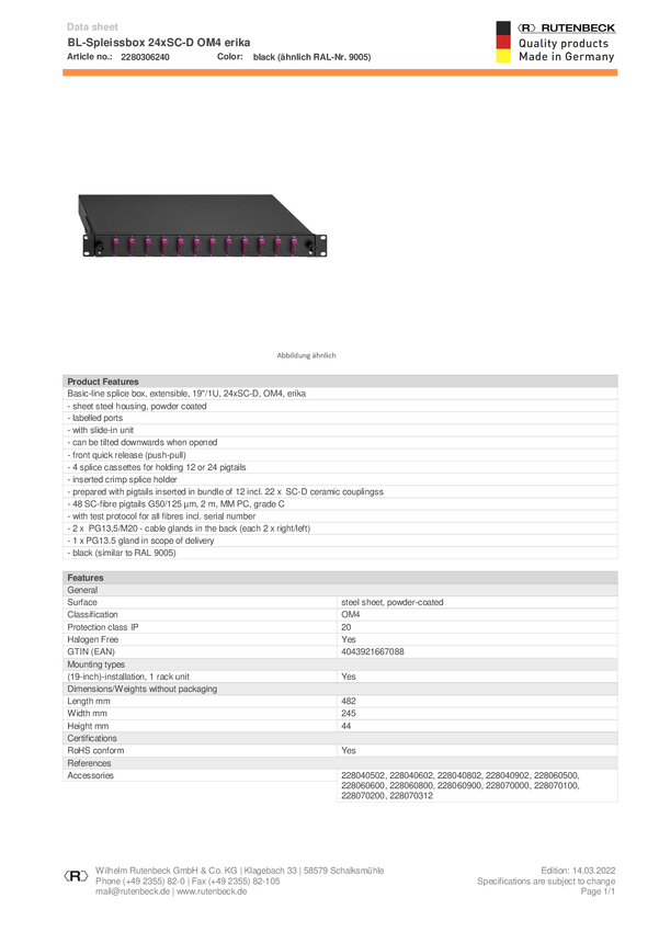 Rozdzielacz światłowodowy Rutenbeck 24xSC-D OM4 erikavio 24 Porty 1 U