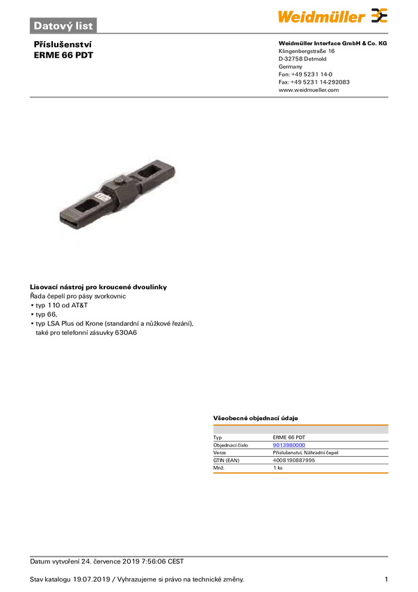 Weidmüller 9013980000 ERME 66 PDT Ostrze narzędzia do wyciskania Kompatybilność kabel skrętka Kompatybilność z markami W
