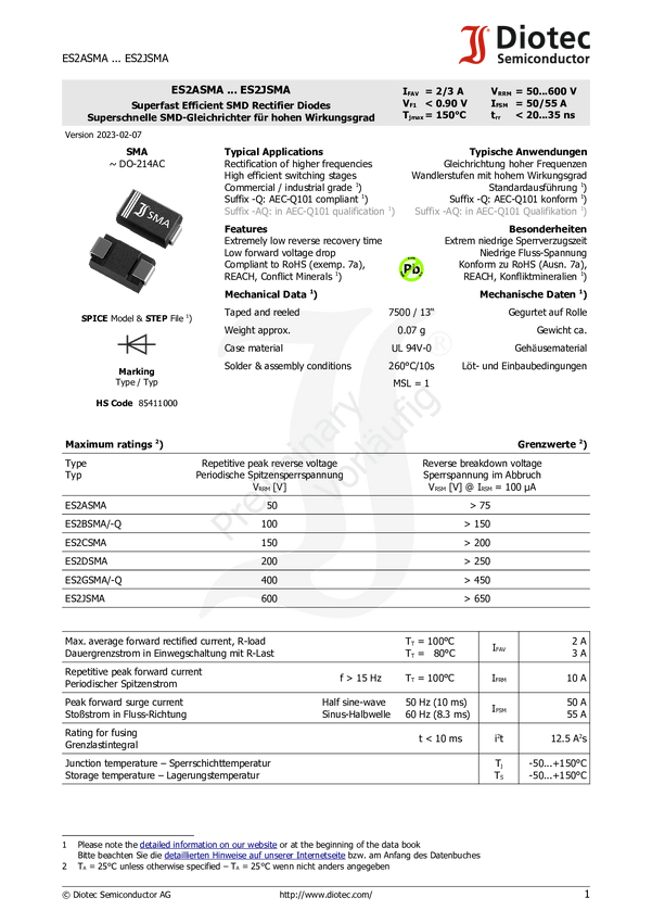 Dioda prostownicza Diotec ES2JSMA N/A N/A