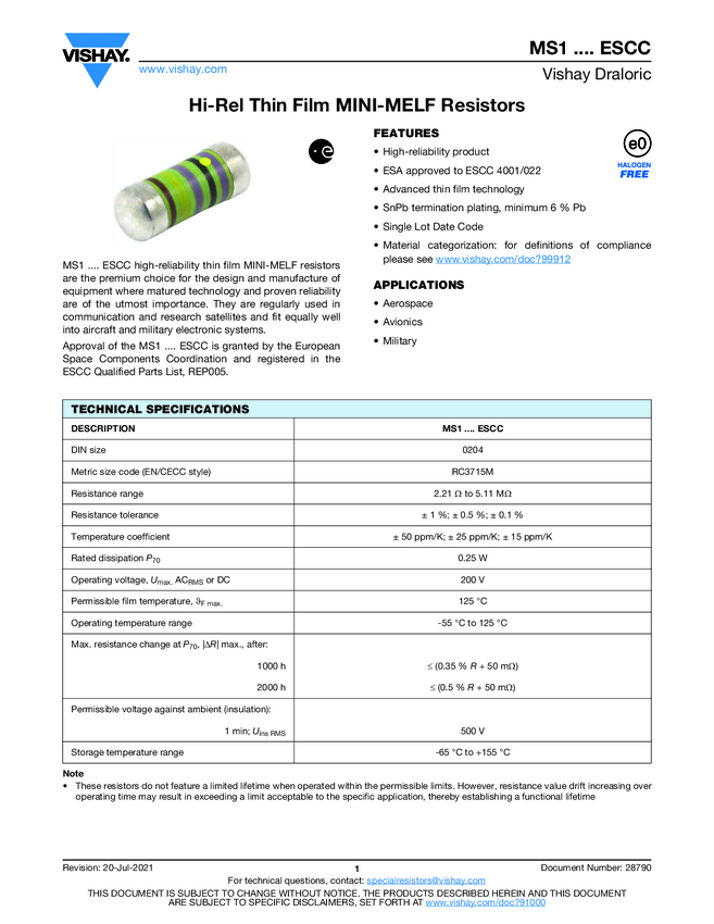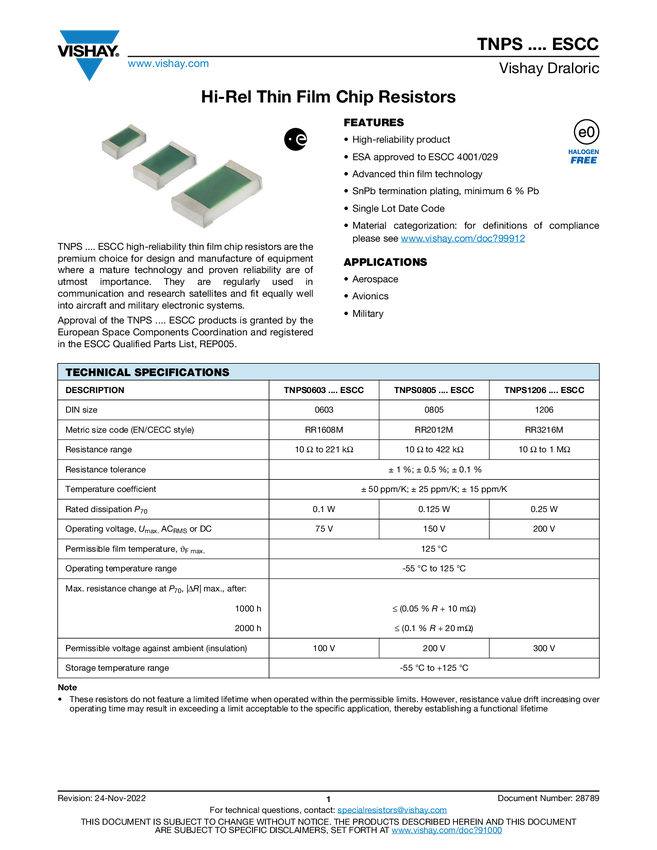 ESCC 4001/023 Qualified High Precision (5 ppm, 0.01 %), Thin Film Chip Resistors