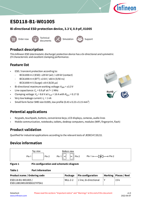 Bi-directional ESD protection device, 3.3 V, 0.9 pF, 01005 This Infineon ESD (electrostatic discharge) protection device has a bi-directional and symmetric I/V characteristic and excellent clamping performance.