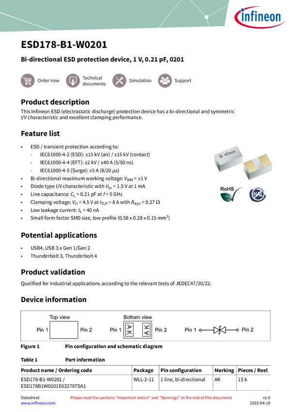 Bi-directional ESD protection device, 16 V, 0.10 pF, 0201 This Infineon ESD (electrostatic discharge) protection device has a bi-directional and symmetric I/V characteristic and excellent clamping performance combined with an extremely low capacitance.