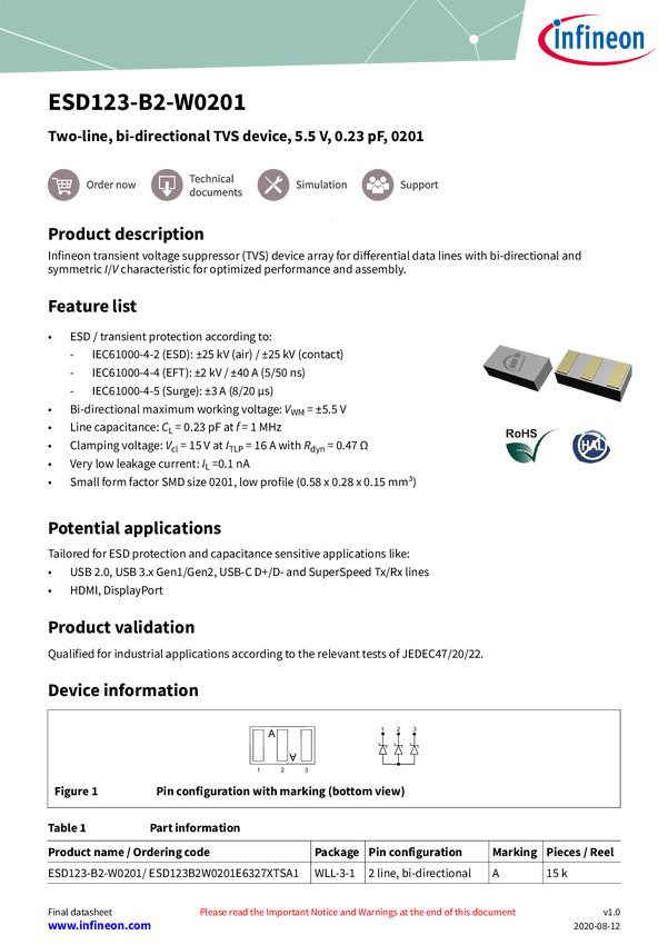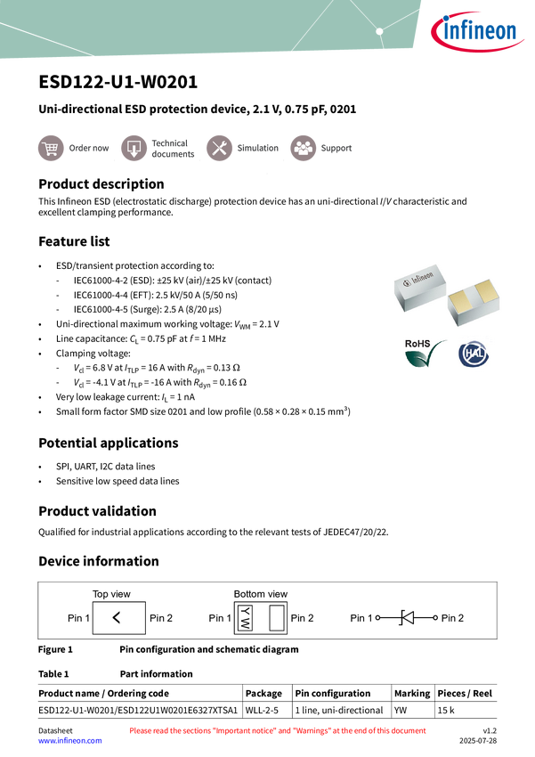 Uni-directional ESD protection device, 2.1 V, 0.75 pF, 0201 This Infineon ESD (electrostatic discharge) protection device has an uni-directional I/V characteristic and excellent clamping performance.