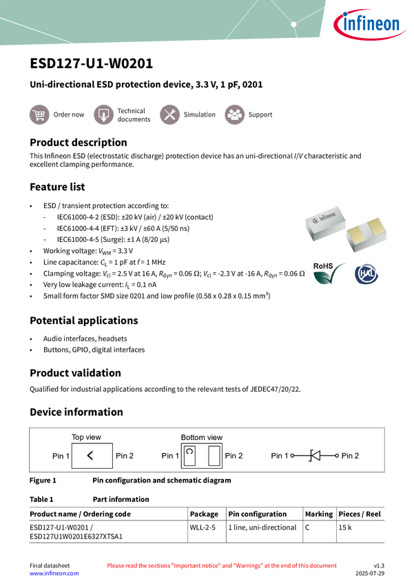 Uni-directional ESD protection device, 3.3 V, 1 pF, 0201 This Infineon ESD (electrostatic discharge) protection device has an unidirectional I/V characteristic andexcellent clamping performance.