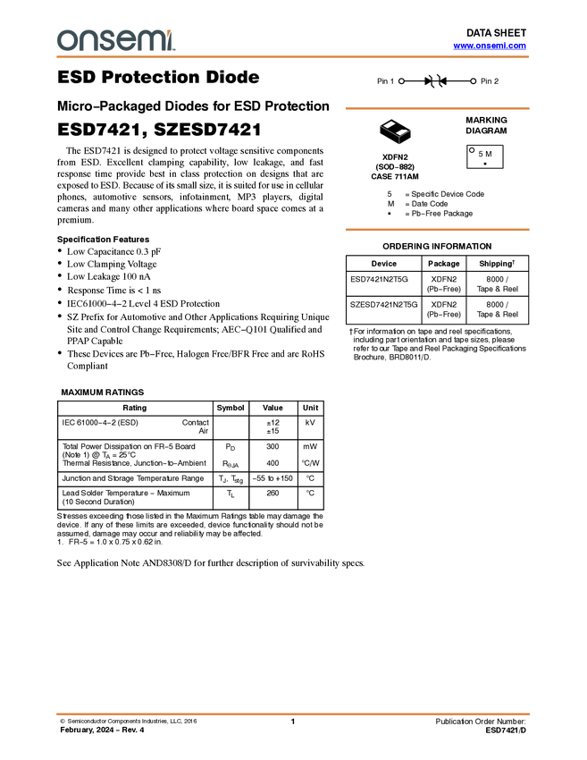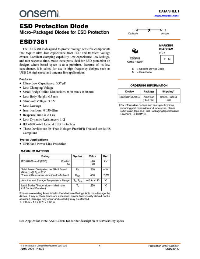 ESD Protection Diode, Low Leakage, Fast Response Time, with Clamping Capability