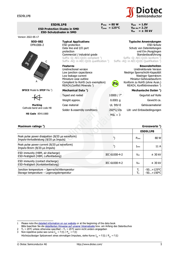 Diotec ESD Dioda ESD ESD9L1P8 DFN1006-2