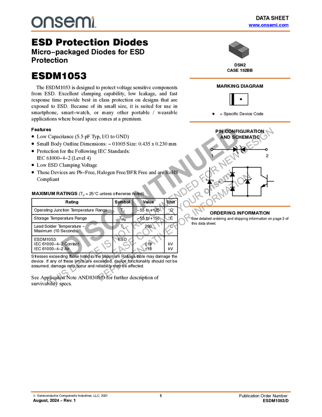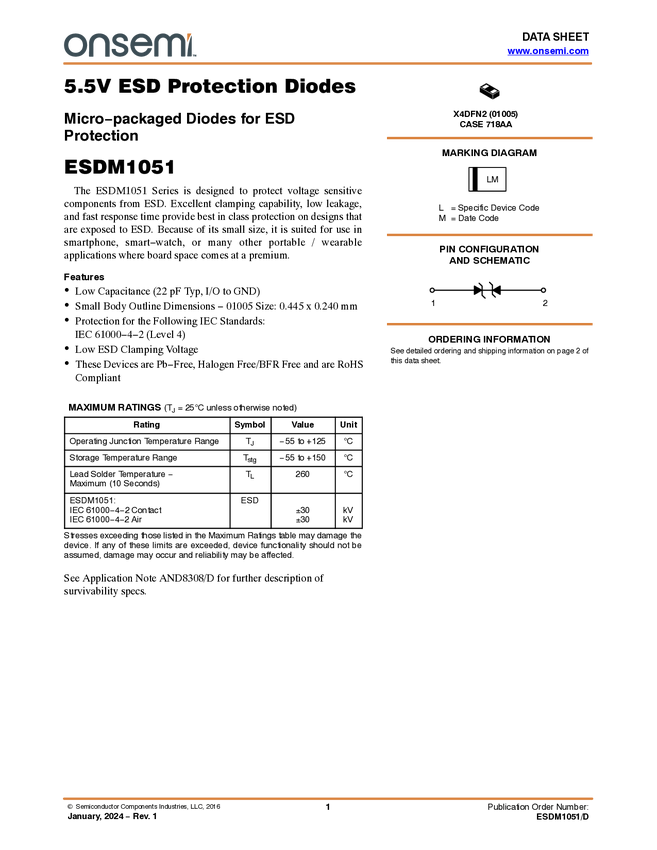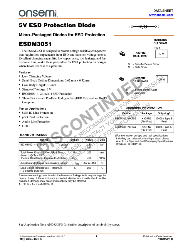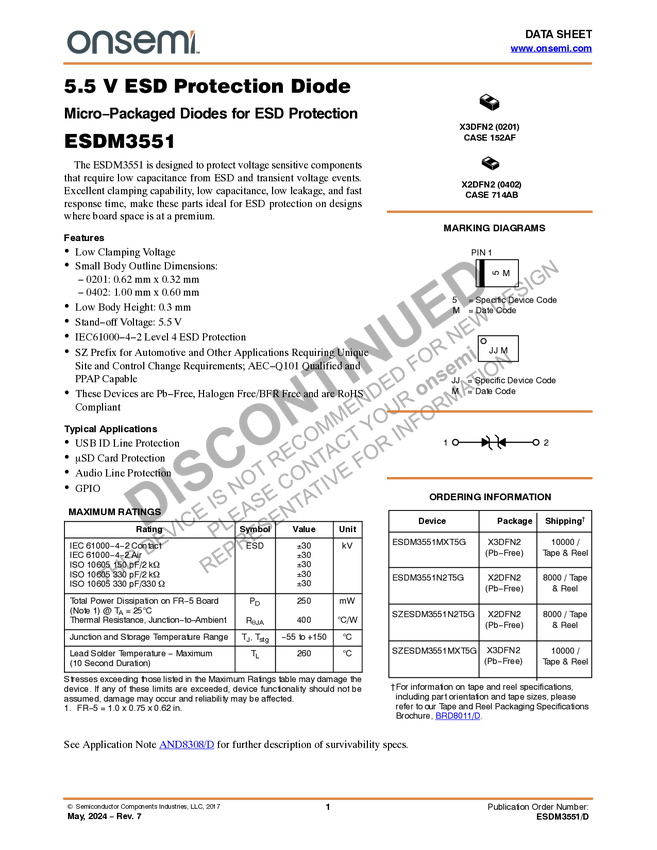 5.5 V Bidirectional micro−packaged ESD Protection Diode