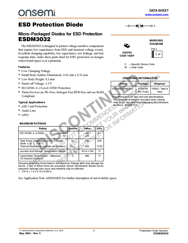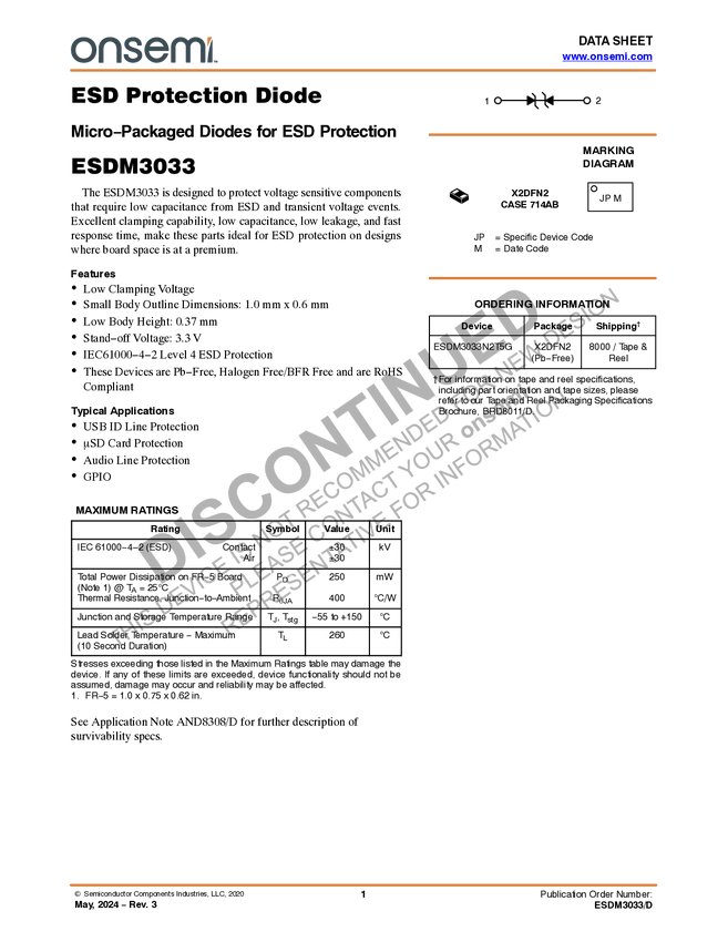 3.3 V Bidirectional Micro−Packaged ESD Protection Diode