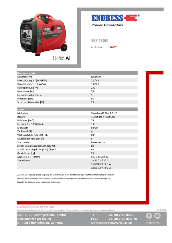 Agregat prądotwórczy, inwerterowy Endress ESE 2300i 1800 W 23 kg