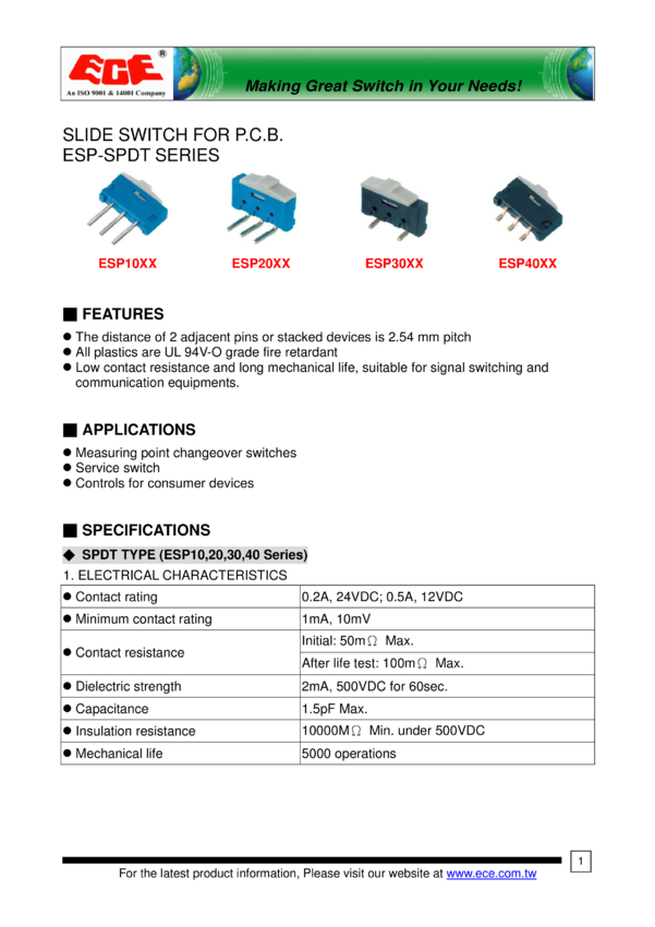 Miniaturowy przełącznik suwakowy, 1-biegowy, 2-pozycyjny, sposób przeł. ON-ON/ Producent ECE