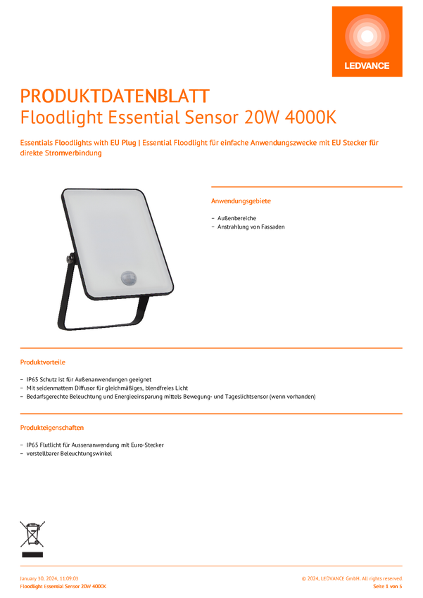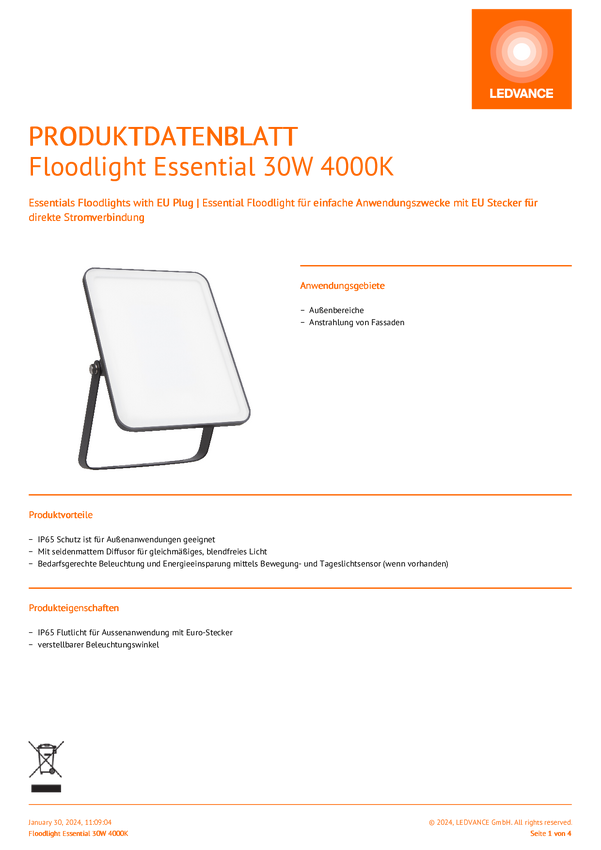 Reflektor LED LEDVANCE FL Essential Plug 4099854094521 30 W 2700 lm IP65