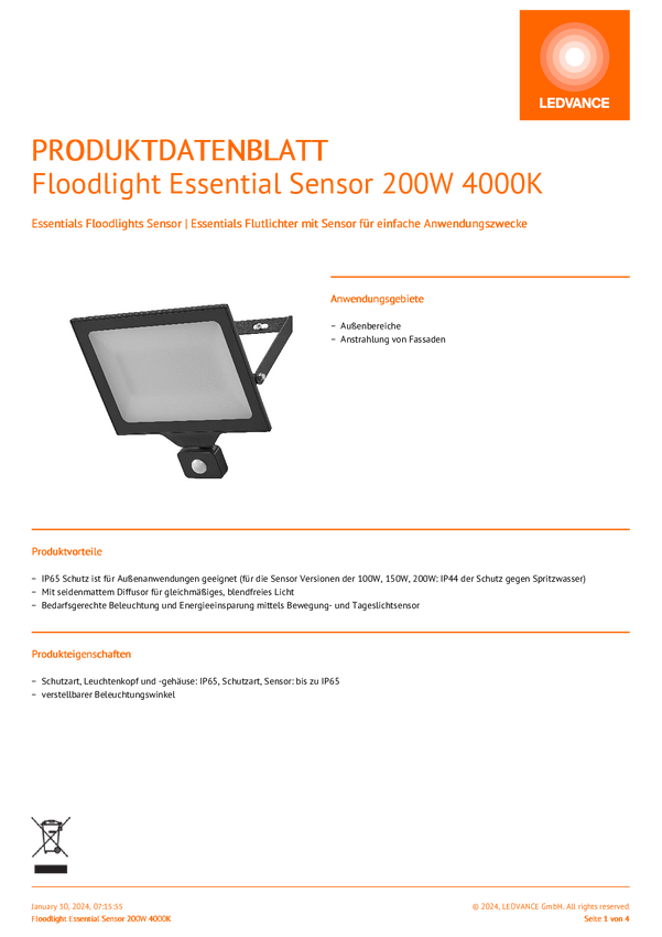 Reflektor LED LEDVANCE FL Essential 4058075831636 200 W 20000 lm IP44