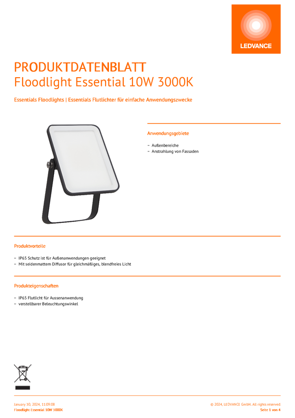 Reflektor LED LEDVANCE FL Essential 4058075767911 10 W 750 lm IP65